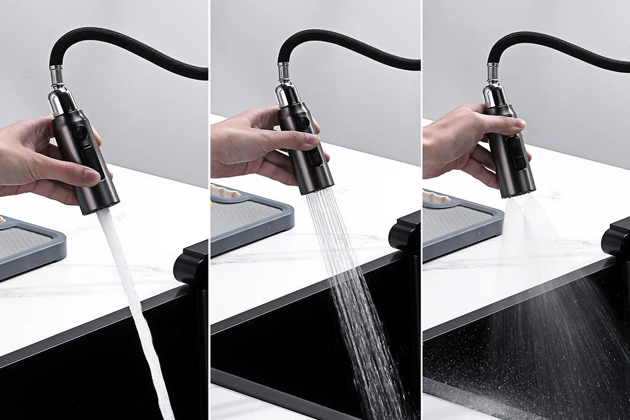 The versatile pull-out faucet boasts a myriad of water outlet modes, catering to diverse kitchen scenarios. This not only amplifies the faucet's functionality but also optimizes efficiency during cleaning tasks.