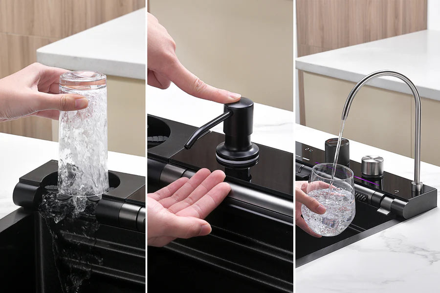 Discover how easy cleaning can be with a kitchen sink featuring not one, but two elegant waterfall faucets with adjustable angles!