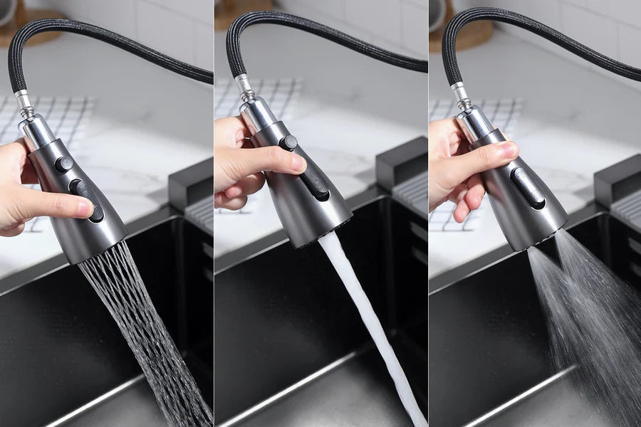 The versatile pull-out faucet boasts a myriad of water outlet modes, catering to diverse kitchen scenarios. This not only amplifies the faucet's functionality but also optimizes efficiency during cleaning tasks.